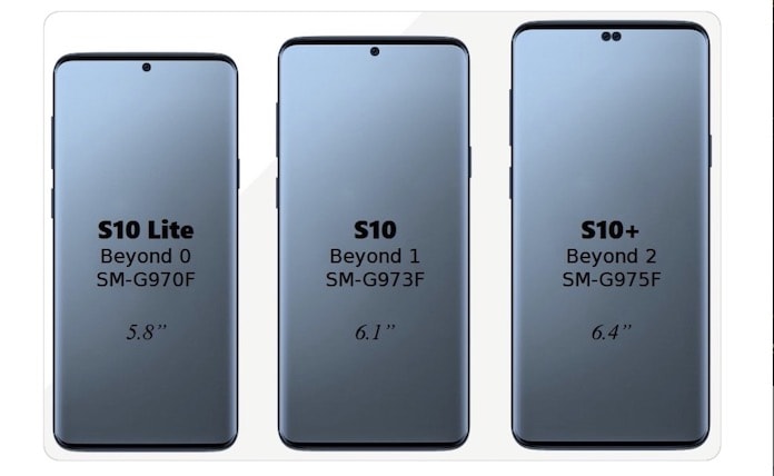 Yapımcılara göre, en küçük ve en uygun fiyatlı Galaxy S10 Lite, ortadaki kamera için bir kamera deliğine sahip 5.8 inçlik bir ekran ile geliyorken, normal Galaxy S10, aynı ön bakan kamera tasarımına sahip 6.1 inçlik bir paneli kullanacak.