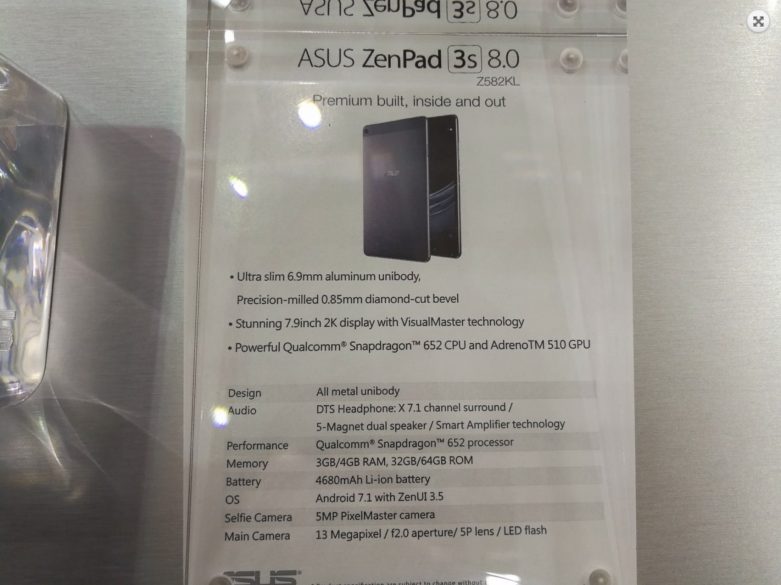 7.9″ ekran, 1536 x 2048 piksel çözünürlüğe sahip ve bu da lager ZenPad 3S 10 Z500KL‘nin piksel sayısıyla eşleşiyor. Arkada 13 MP bir kamera var ve ön tarafta 5 MP‘lik bir kamera görülüyor. Tablet Android Nougat 7.1 işletim sistemini kullanacak ve 6.9 mm kalınlığa sahip “alüminyum unibody” tasarımı ile geliyor.
