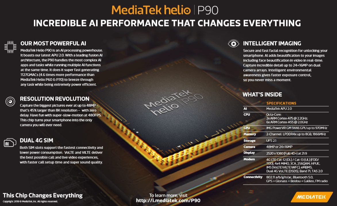 Helio P90 yonga seti 2+6 formatında düzenlenmiş çekirdekleriyle 12nm sekiz çekirdekli bir işlemcidir. İki çekirdek yüksek performanslı Cortex-A75 çekirdekleri 2.2GHz hızında işlem yaparken, altı çekirdek ise 2.0GHz hızında güçlendirilmiş Cortex-A55 çekirdeklerdir. MediaTek ayrıca, 960MHz’de saat hızına sahip bir PowerVR GM 9946 GPU için Mali GPU’yu da terk etti.