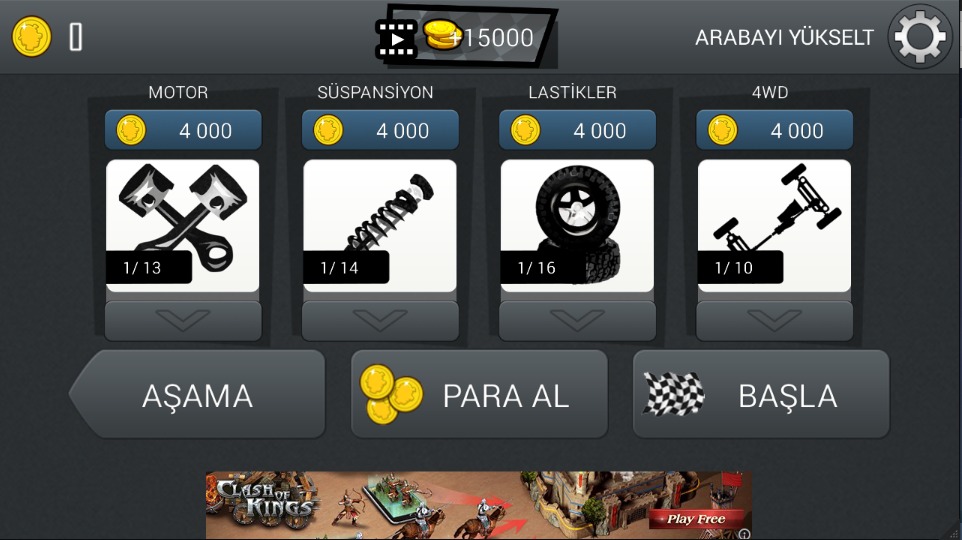 Daha fazla hız için motor özelliklerini, daha yumuşak bir sürüş için süspansiyon, daha kolay hızlana bilmek ve durmak için lastikler ve rampaları daha kolay tırmanabilmek için 4WD ( 4 çeker ) aksamlarını yükseltebiliriz. Oyun içerisinde ilerledikçe ve daha öncede bahsettiğimiz üzere yeteri kadar altın toplamamız halinde diğer araçlarda farklı özelliklerin açıldığını da görebiliriz.