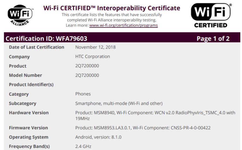 Söz konusu akıllı telefon Wi-Fi İttifakı (Wi-Fi Alliance) sayesinde tespit edildi. Görüntülenen belge, HTC 2Q720000 adına sahip bir akıllı telefon modelini ortaya çıkardı. Wi-Fi sertifikası genellikle yakın bir zamanda piyasaya sürülecek olan telefonları açıklar. Bu yüzden bu HTC’nin cep telefonunu 2018 bitmeden önce piyasaya süreceği ilk tahminler arasında yer alıyor.