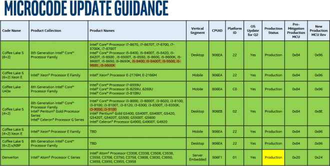 Sızan bu belge aslında Haziran ayında Intel tarafından yayınlanan son mikro kod güncellemeleri hakkında bir kılavuz. Yedi adete kadar 9 nesil Core işlemcisi görünüyor. Listenin tamamındaki işlemciler masaüstü kullanımı ve yeni 9000 serisinin bir parçası için tasarlanmış yeni bir x86 işlemcisinin adlarını veya model numaralarını içeriyor. Sırasıyla i3-9000, i3-9100, i5-9400, i5-9400T, i5-9500, i5-9600 ve i5-9600K listedeki işlemci modelleri olarak görülüyor.