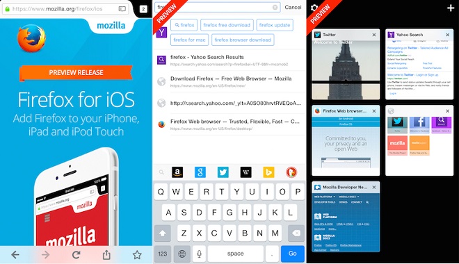İlk önizleme farklı arama motorlarından akıllı arama önerileri sunuluyor. Yer imleri, şifreler ve tarayıcı geçmişi masaüstü sürümünden Firefox iOS uygulamasına taşınabiliyor ve sekmeler önizleme halinde görülebiliyor.
