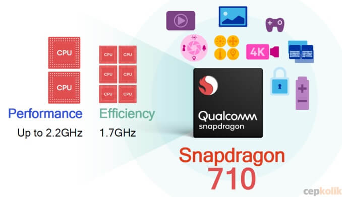 Snapdragon 710 yonga seti 2,2 GHz hızında çalışan iki adet Kryo 360 Cortex A75 ve 1,7 GHz‘lik bir işlemci hızı sunan altı adet Kryo 360 Cortex A55 çekirdeği içeriyor. Okta-çekirdekli işlemci grafiklerin yüzde 35 daha iyi oluşturulmasını vaat eden Adreno 616 GPU ile birleştirildi.