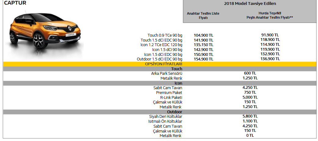 2018 model araçlar için 2019 yılı Mart ayında geçerli olan fiyatlara hemen aşağıda yer alan görselden ulaşabilirsiniz. Yine görsel üzerinde, özelleştirme seçeneklerini ve paket seçeneklerini de göreceksiniz. Burada yer alan aksesuar seçimleri de yine sürücülerin kendi isteklerine göre özelleştirebilecekleri kısımlar olarak karşımıza çıkıyor. Aksesuar fiyatlarının da resmi olarak belirlenmiş fiyatlar olduğunu ekleyelim.