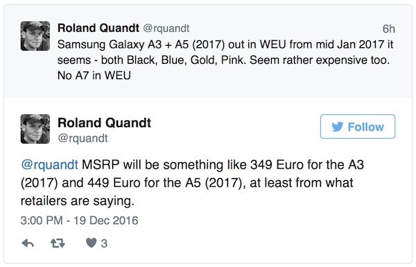 Tipster, Galaxy A3 (2017) ve A5 (2017) ‘ye geri dönerken, Galaxy A3 için beklen fiyat 349 € (yaklaşık 365 $) civarında bir MSRP’ye sahip olacağını ve A5 (2017) modelinin 449 €’ luk (yaklaşık 470 $) etiketi taşıması beklendiğini belirtti.