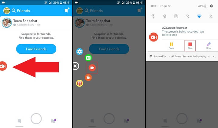 Kayda başlamak için kamera simgesini seçin ve ardından yakalamak istediğiniz Snapchat videosunu hızlı bir şekilde açın. Kaydı durdurmak için bildirim gölgesini aşağı çekin ve durdur düğmesine dokunun. Artık videonuz kaydedildi.