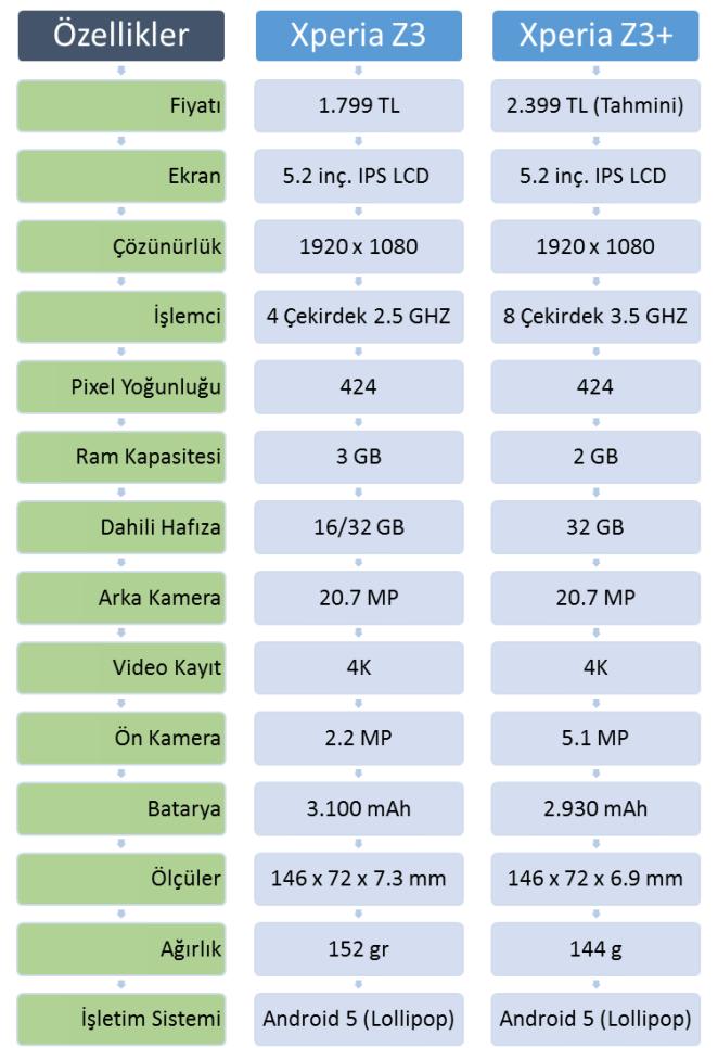 Xperia Z3+ modeli Xperia Z3 modeline göre biraz daha ince ve hafif, diğer yandan ekran boyutu ve ekran çözünürlükleri aynı olan akıllı telefonların içerisinde 3 GB RAM yer almakta, yani bellek konusunda da aynı özelliklere sahipler. Xperia Z3+ modelinin Xperia Z3’den farklı olarak işlemciler gösterilebilir.
