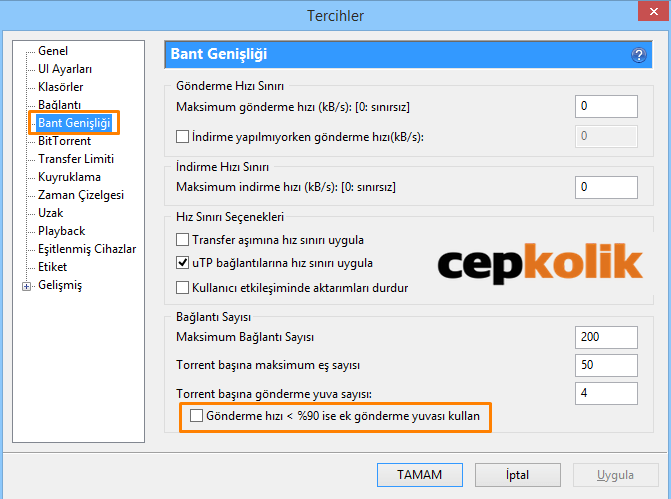 3. Daha sonra aynı şekilde Tercihler kısmını açıyoruz. Şimdi ise “Bant Genişliği” sekmesine tıklıyoruz. Açılan pencerenin en alt tarafında yer alan “Gönderme hızı < %90 ise ek gönderme yuvası kullan” seçeneğinin yanındaki kutucuk tıklanmış ise tiki kaldırıyoruz. Hemen ardından yukarıda yer alan “Maksimum bağlantı sayısı” , “Torrent başına maksimum eş sayısı” ve “Torrent başına gönderme yuva sayısı” değerlerini değiştiriyoruz. Sırayla 200-50-4 yazan bu değerleri 2500-500-10 olarak değiştirip tamam diyoruz.