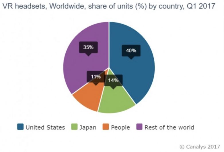 VR dünyası büyümeye devam ediyor ve ABD arkasındaki ana ülke. 2017 yılının ocak-mart çeyreğinde sevk edilen tüm VR kulaklık setlerinin % 40’ı ABD’den geliyor. İkincisi % 14 veya 81,000 VR ünitesi olan Japonya, kulaklıkların çoğunu PlayStation VR oluşturuyor. (%90’ını)