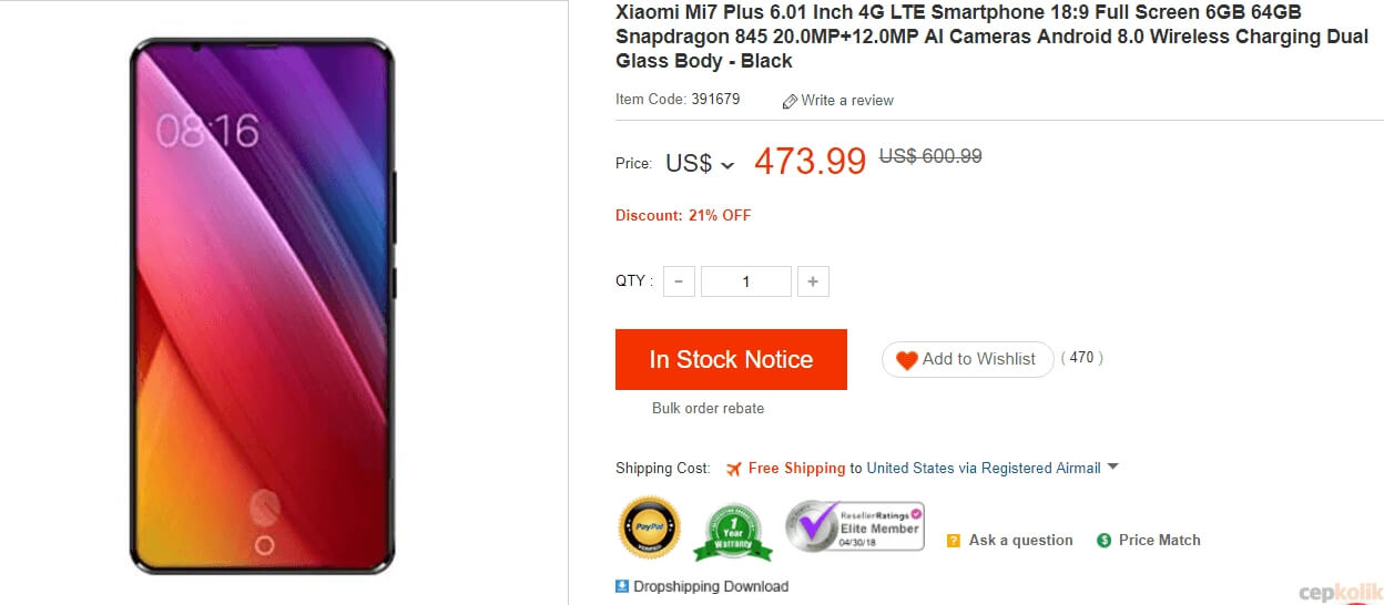 Son zamanlardaki haberlerde Xiaomi‘nin Mi 7 modelinin yanı sıra Mi 7 Plus cep telefonunu da piyasaya süreceği iddia edildi. Resmi lansmanından önce bile Geekbuying, Mi 7 Plus akıllı telefonunu 473.99 USD fiyatla listeledi bile. Ancak liste sahte görünüyor. Geekbuying’in Mi 7 Plus ürün sayfasında belirtilen özellikler sadece onunla ilgili söylentilere dayanıyor gibi görünüyor.