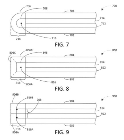 Patent, aynı zamanda, Şekil 7,8 ve 9’da görüldüğü gibi, katlandığında, katlanabilir bir ekran veya cihaz katlandığında iki veya üç parçaya ayrılan bir ekran dahil olmak üzere, üzerine monte edilen menteşenin ve ekranın nasıl yerleştirilebileceğine dair çeşitli örnekler de içermekte.
